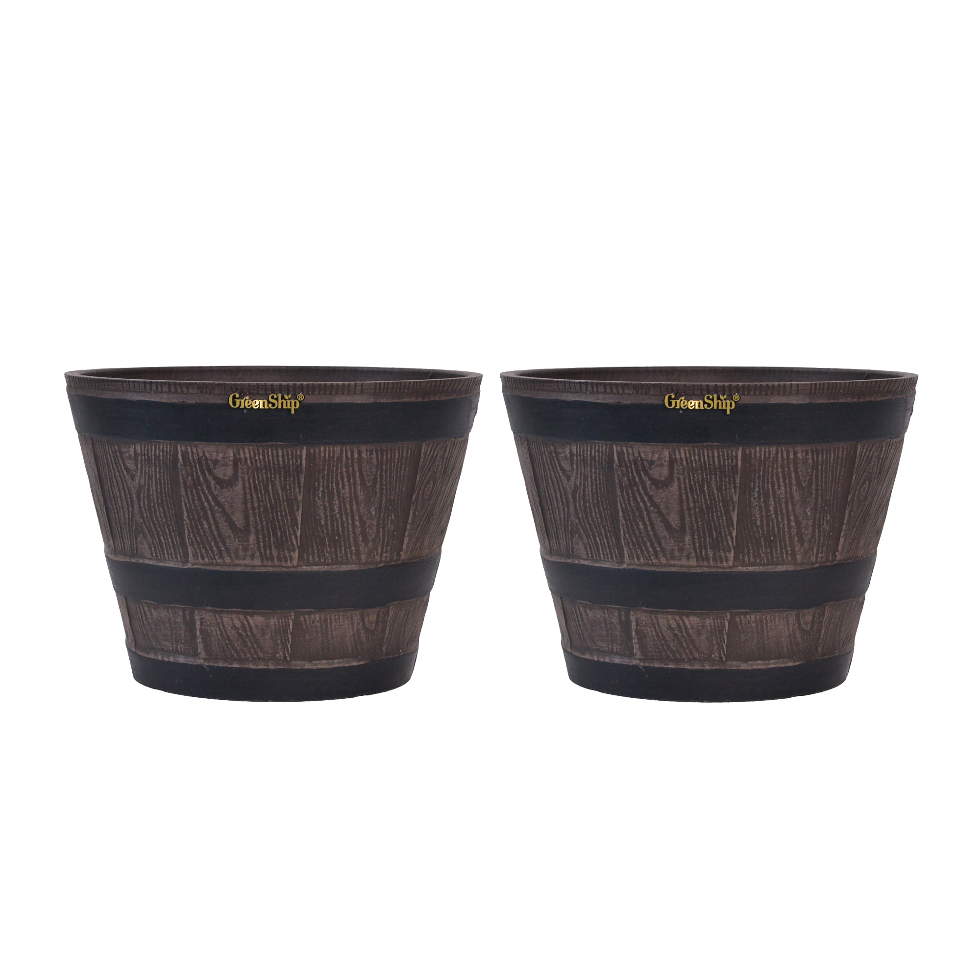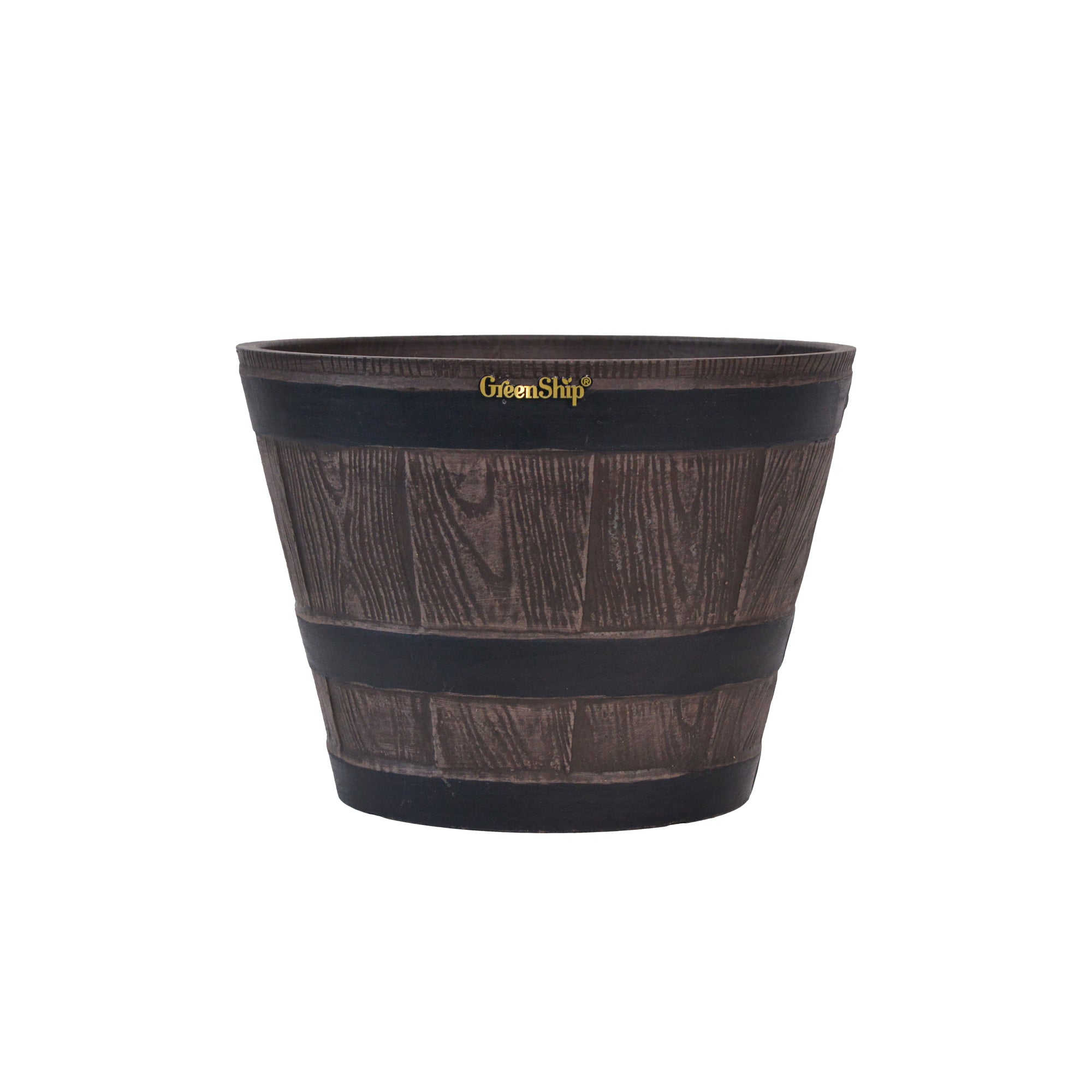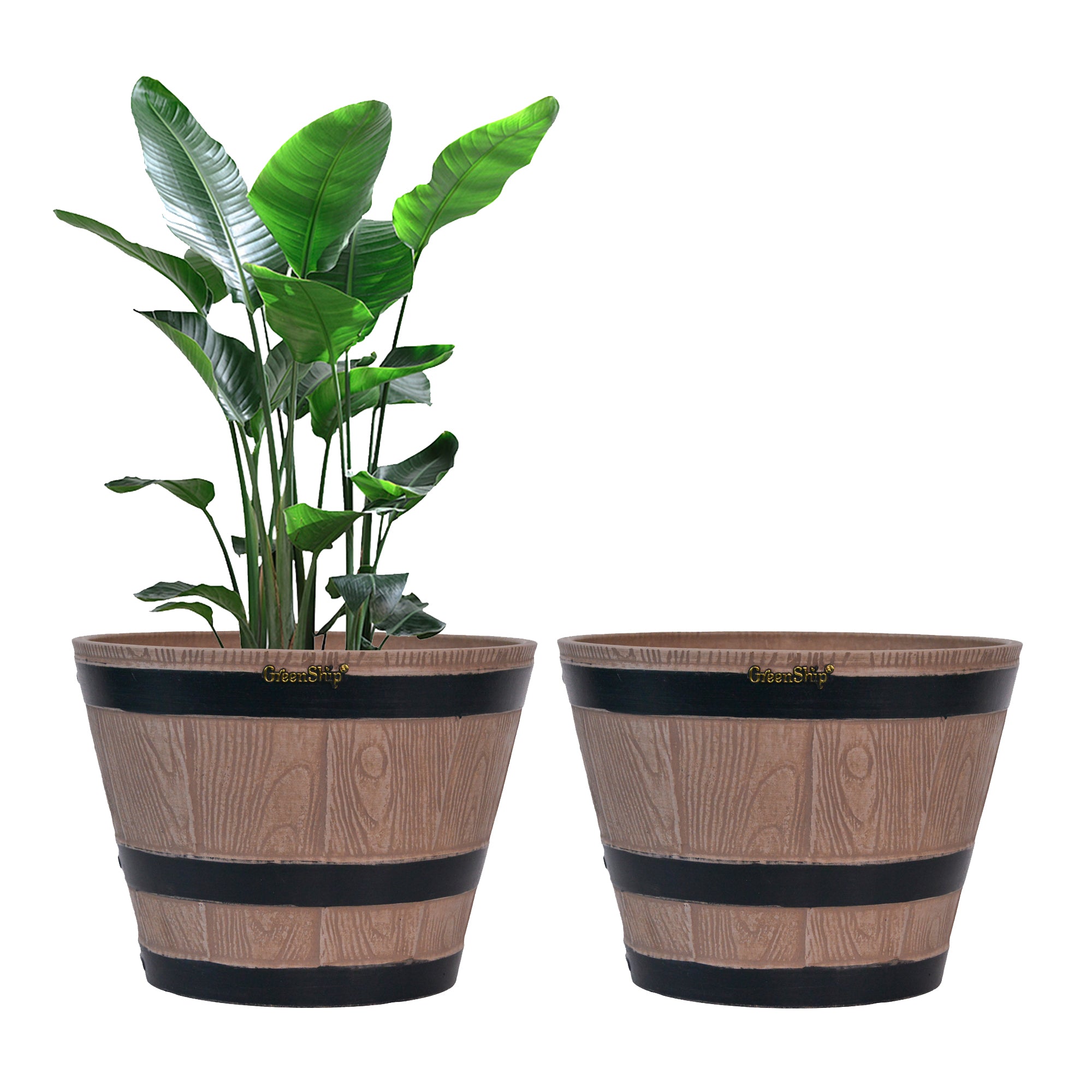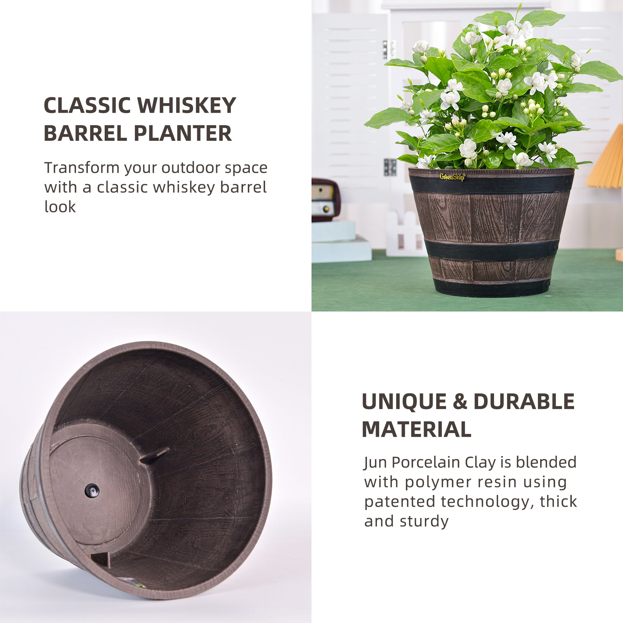 The GreenShip large planter for indoor and outdoor use is made from a unique blend of recycled resin and clay powder, offering exceptional durability, weather resistance, and UV color fastness. With a break-resistant design, these planters can withstand various conditions without fading. Featuring a classic whiskey barrel appearance, they add charm to any space. Perfect for planting flowers, shrubs, or vegetables, these large planters are ideal for creating a vibrant and decorative garden or courtyard. The included drainage holes ensure healthy plant growth by providing efficient water flow.