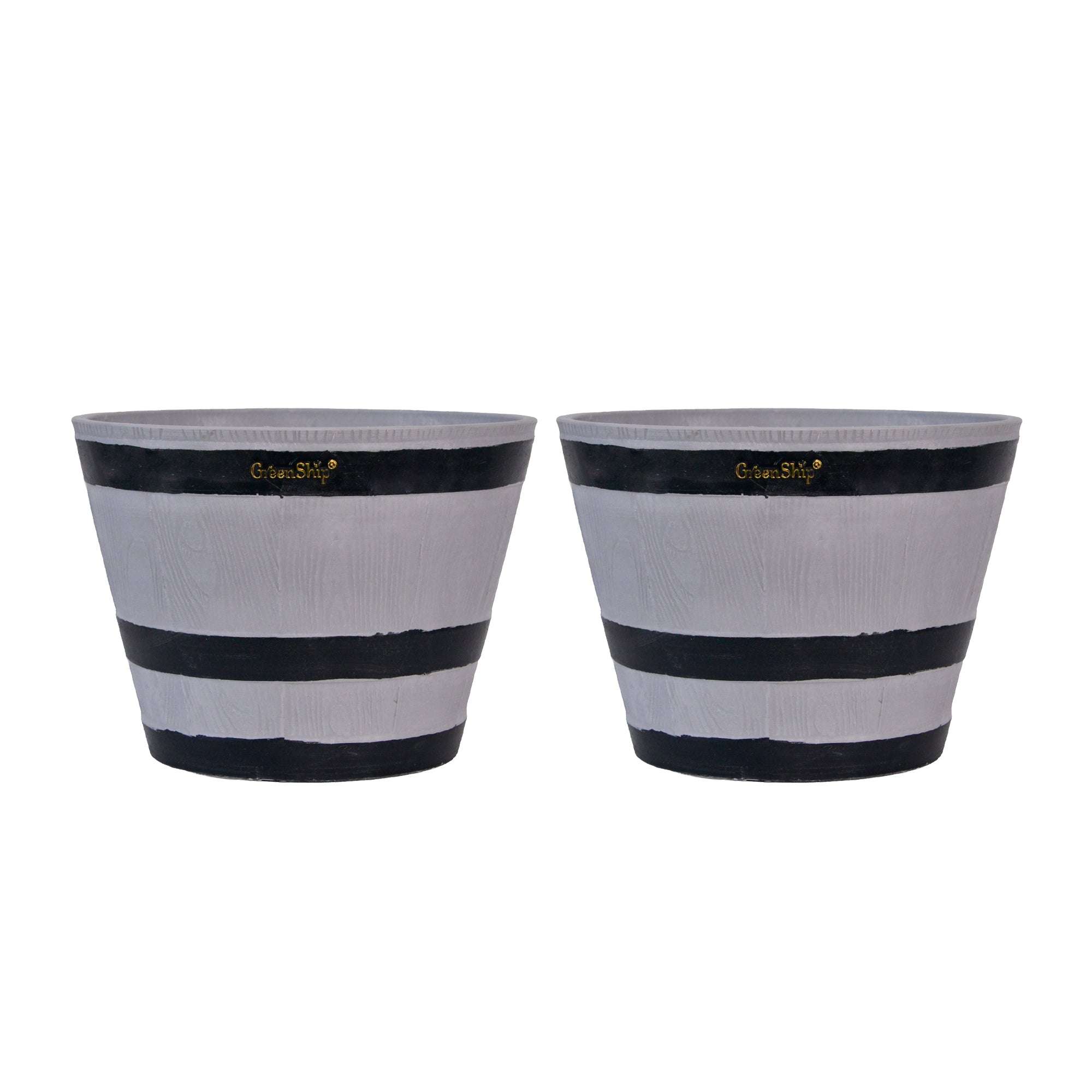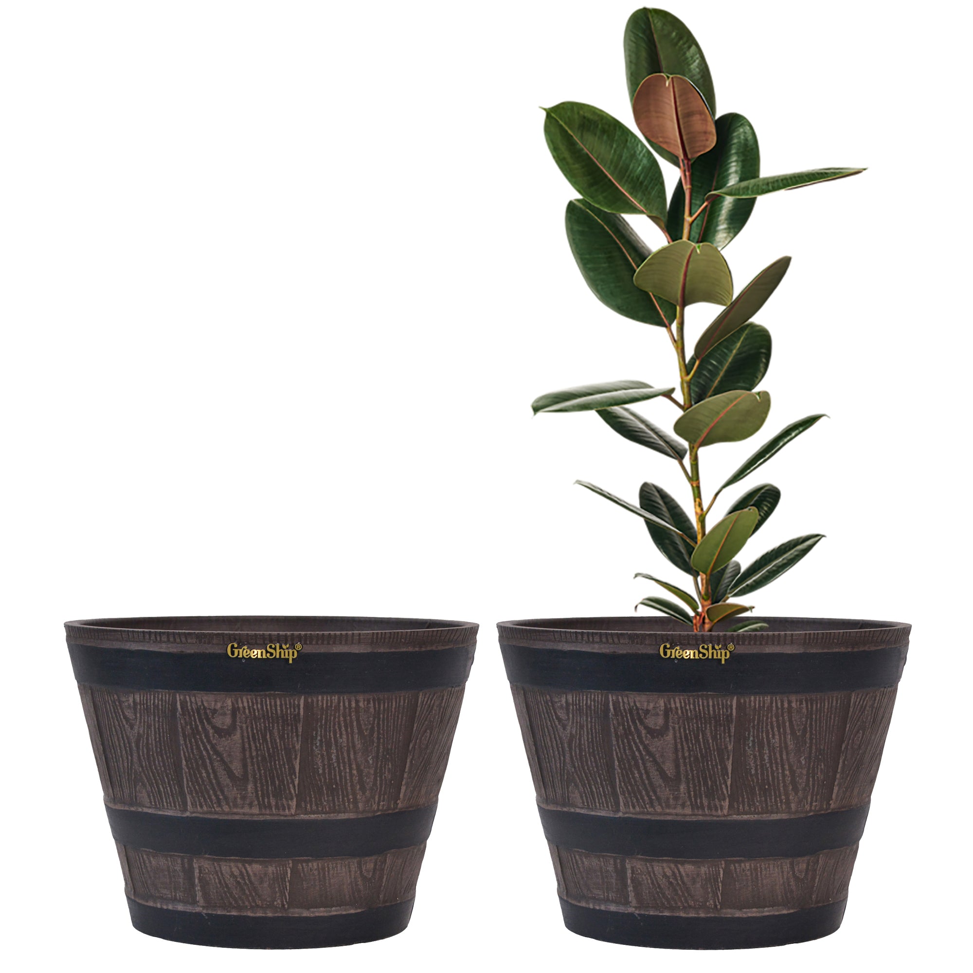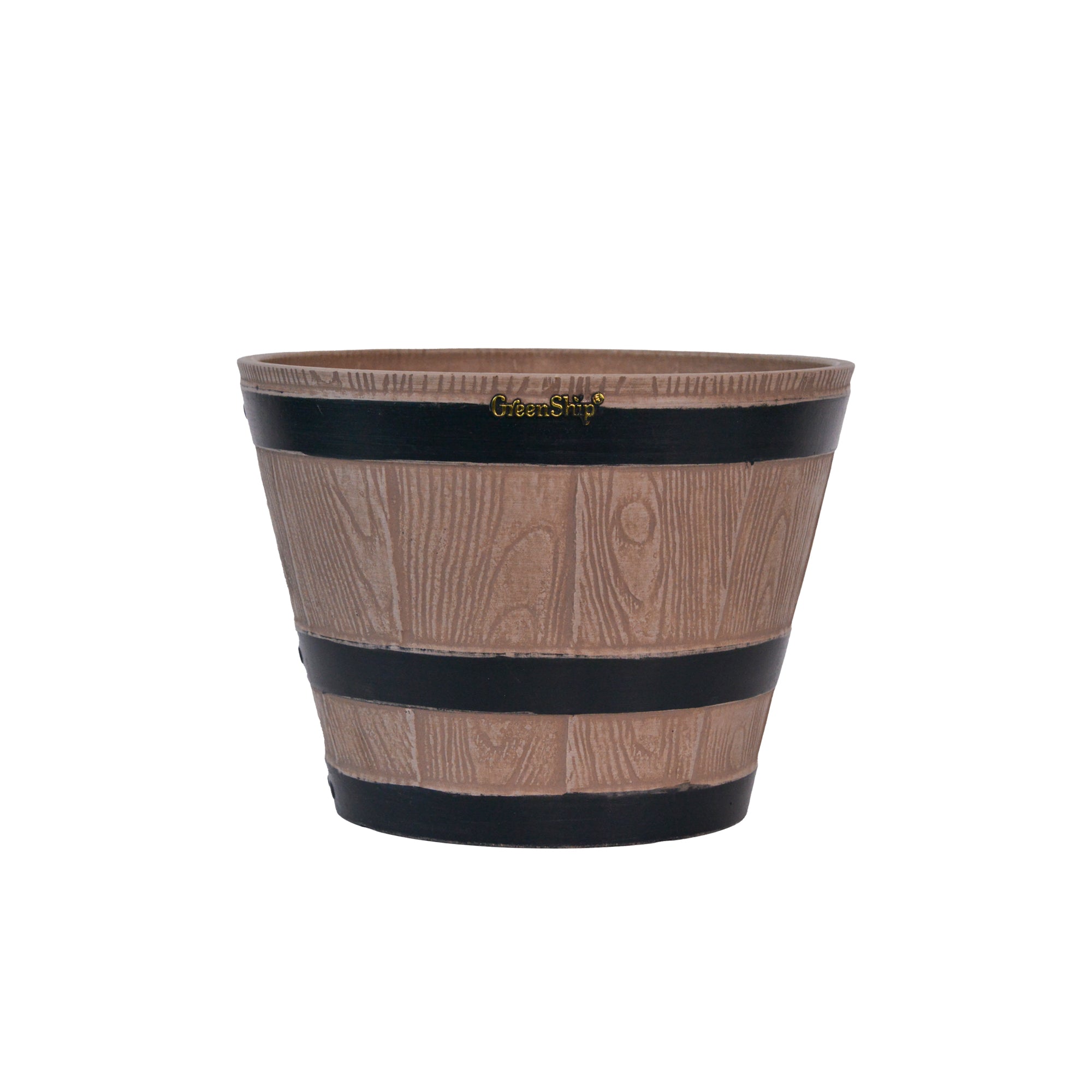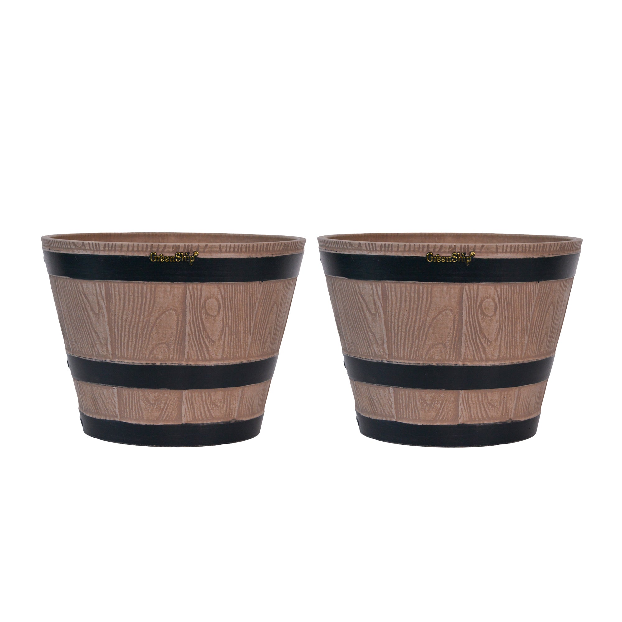 The GreenShip large planter for indoor and outdoor use is made from a unique blend of recycled resin and clay powder, offering exceptional durability, weather resistance, and UV color fastness. With a break-resistant design, these planters can withstand various conditions without fading. Featuring a classic whiskey barrel appearance, they add charm to any space. Perfect for planting flowers, shrubs, or vegetables, these large planters are ideal for creating a vibrant and decorative garden or courtyard. The included drainage holes ensure healthy plant growth by providing efficient water flow.