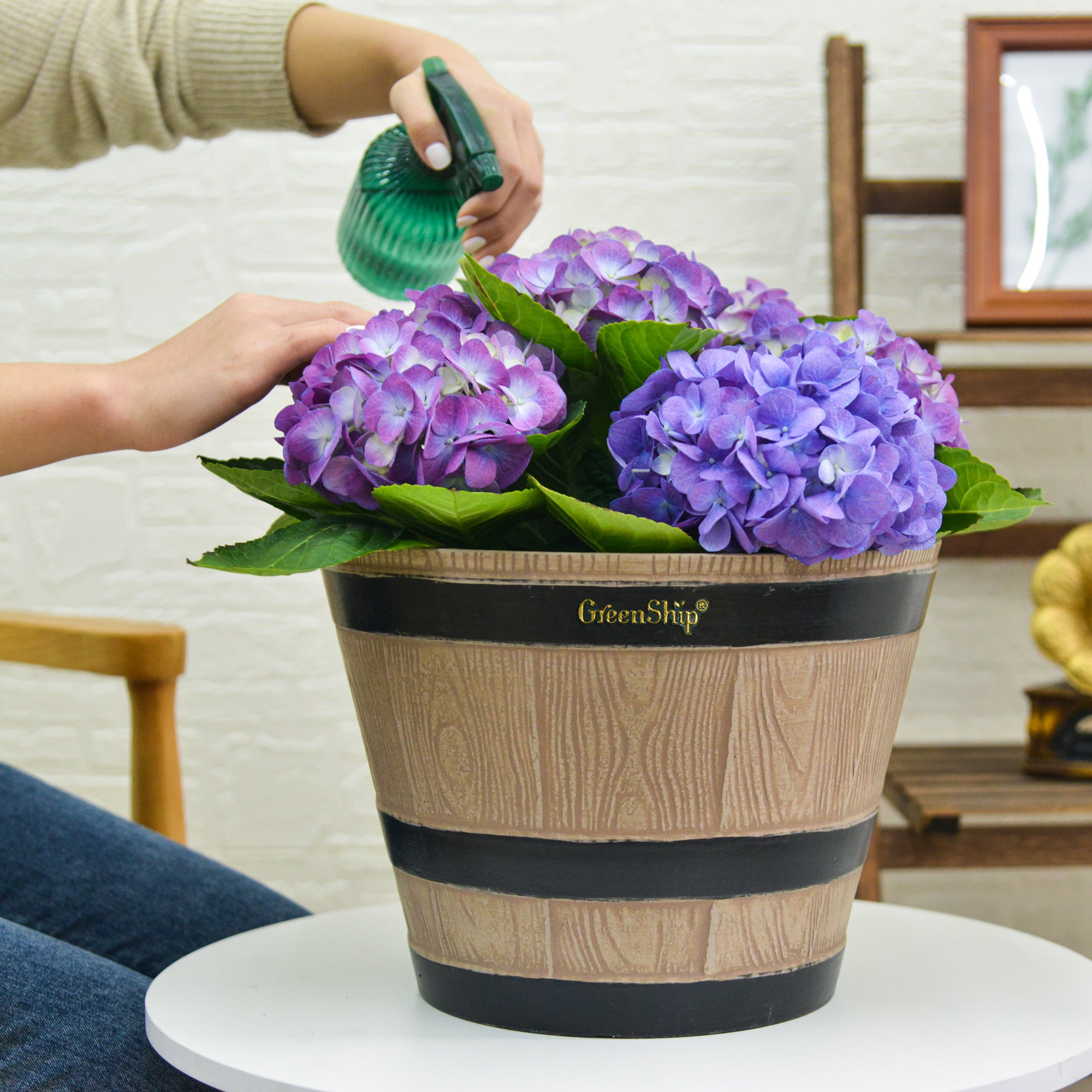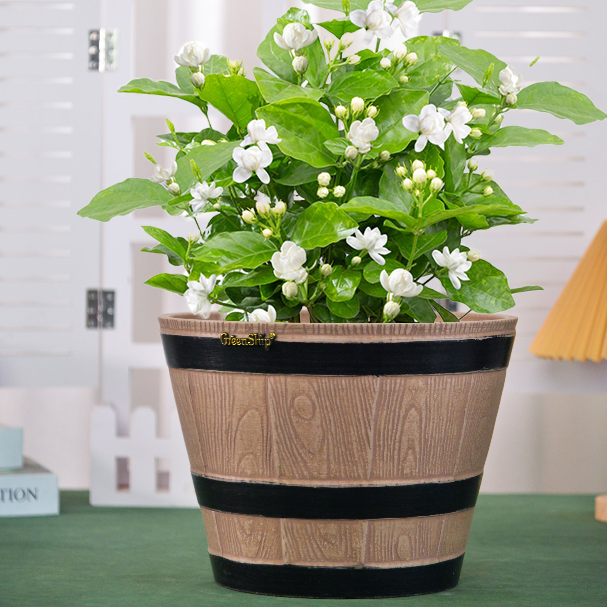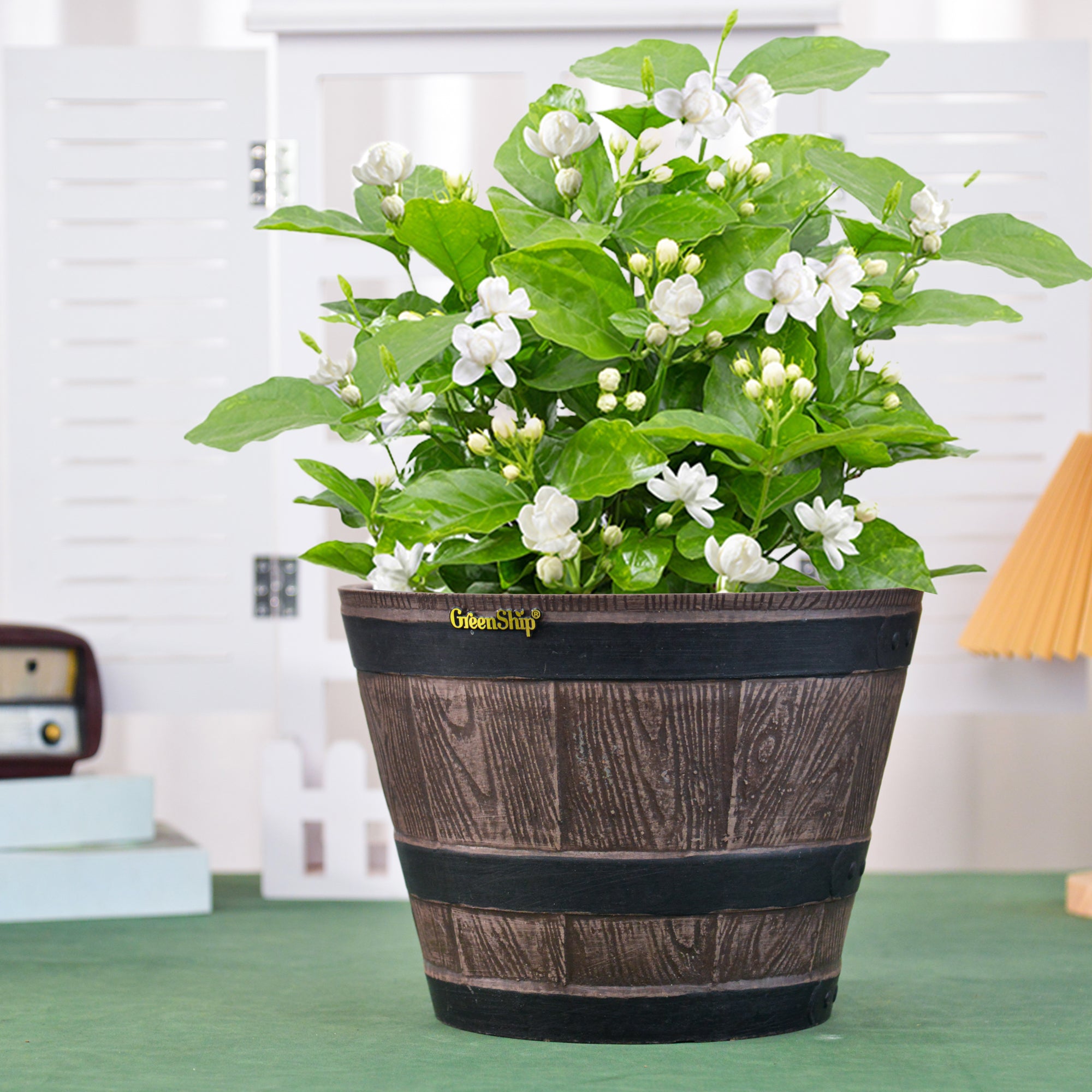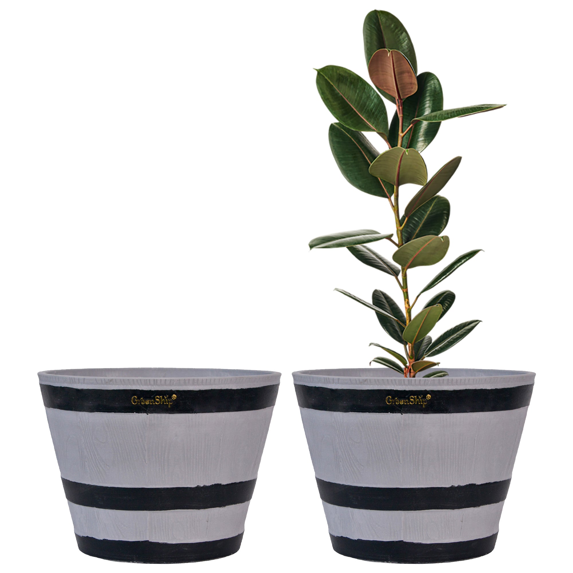 The GreenShip large planter for indoor and outdoor use is made from a unique blend of recycled resin and clay powder, offering exceptional durability, weather resistance, and UV color fastness. With a break-resistant design, these planters can withstand various conditions without fading. Featuring a classic whiskey barrel appearance, they add charm to any space. Perfect for planting flowers, shrubs, or vegetables, these large planters are ideal for creating a vibrant and decorative garden or courtyard. The included drainage holes ensure healthy plant growth by providing efficient water flow.