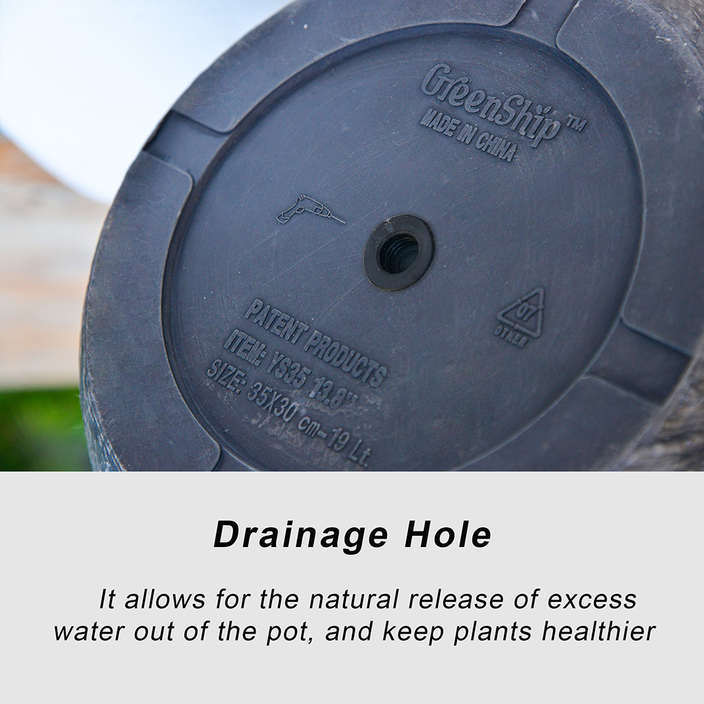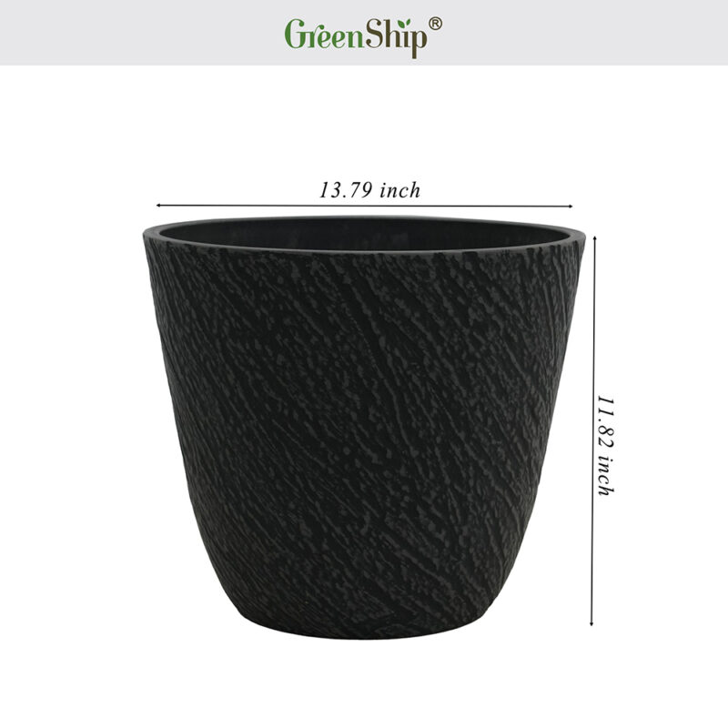 The GreenShip 14-inch black planter combines durability and modern elegance, featuring a sleek cylinder shape with a stone grain relief design. Made from a unique blend of recycled resin and clay powder, this planter is break-resistant, weatherproof, and UV color fast, ensuring long-lasting beauty without fading. Designed for indoor and outdoor use, it adds a sophisticated touch to your home, patio, porch, or garden. Equipped with a drainage hole, it promotes healthy plant growth by preventing water buildup, making it a perfect blend of style and functionality.