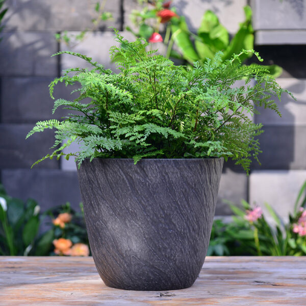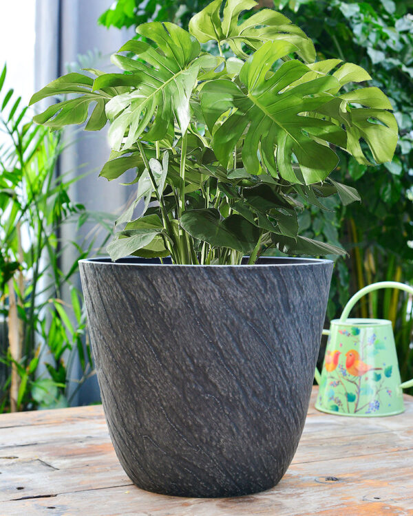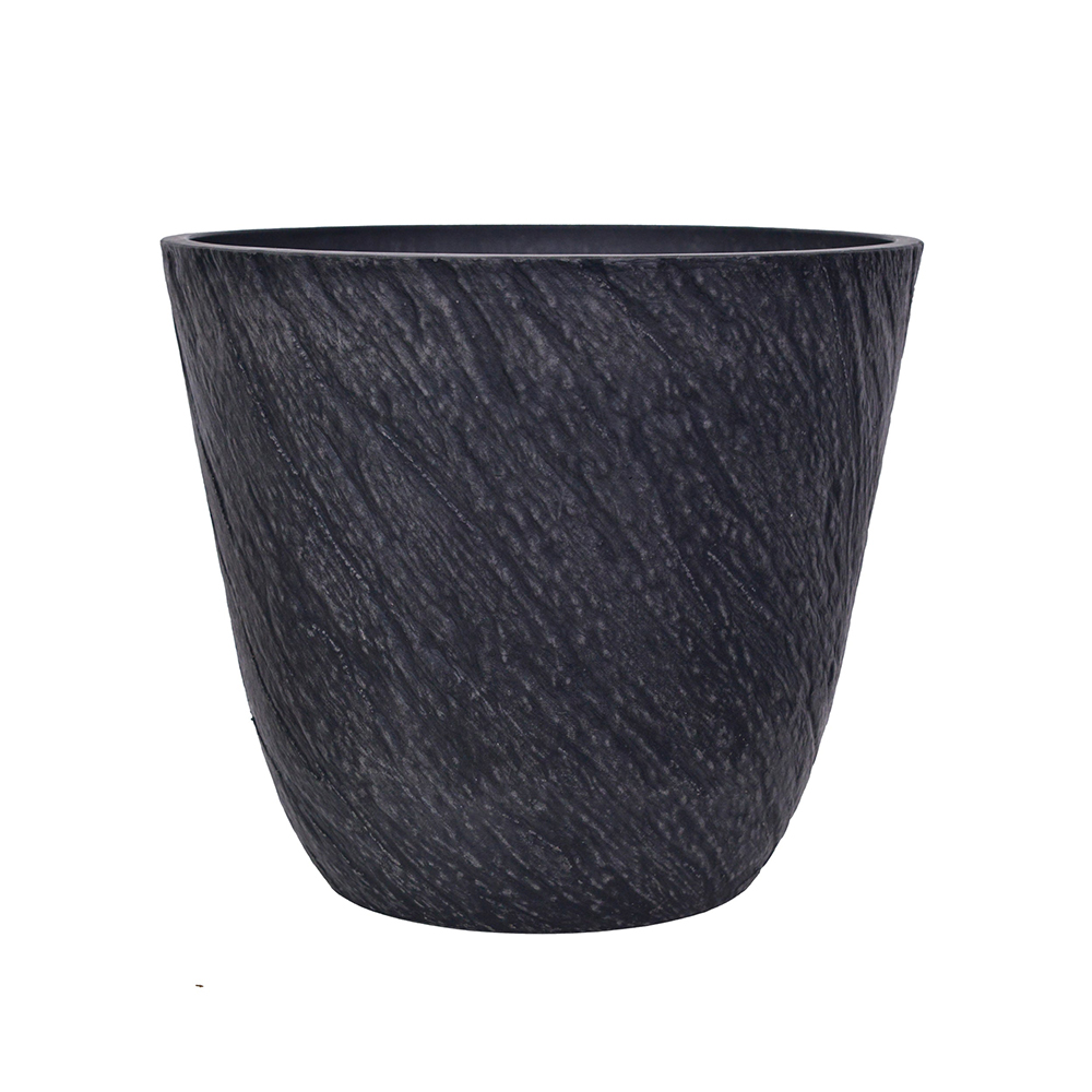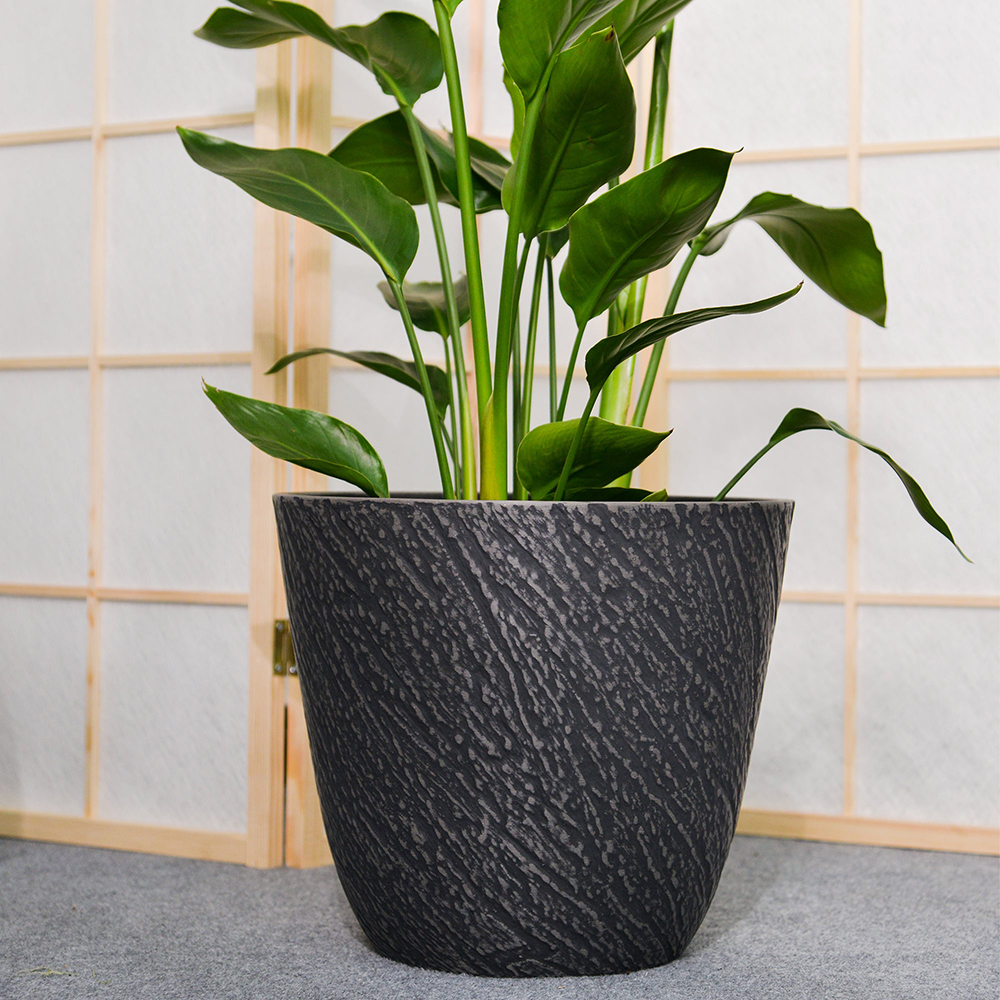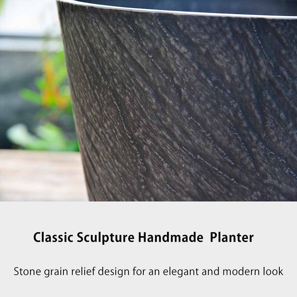14 inch Black Planter for Indoor Outdoor, Stone Grain Relief Decorative Plant Pots with Drainage Hole