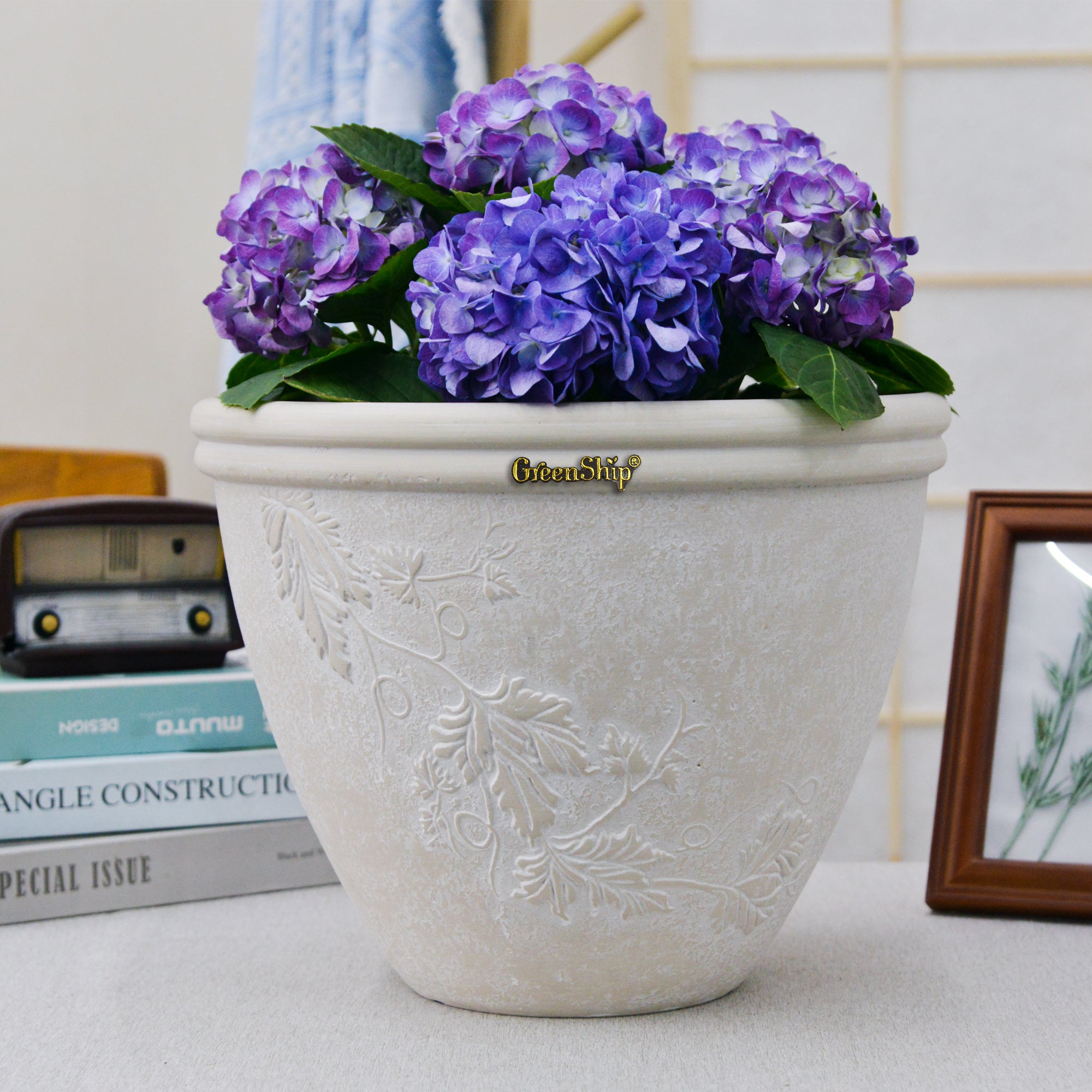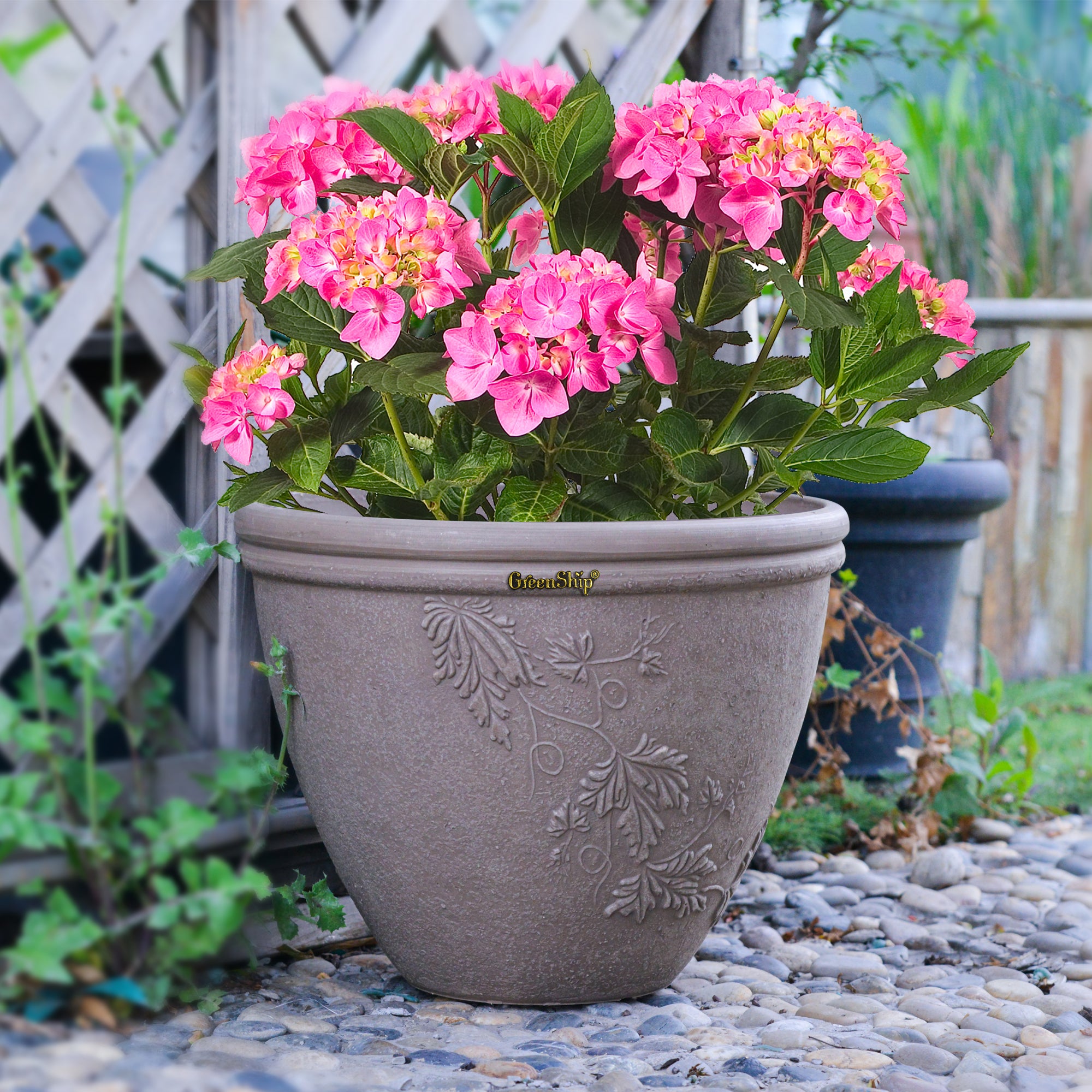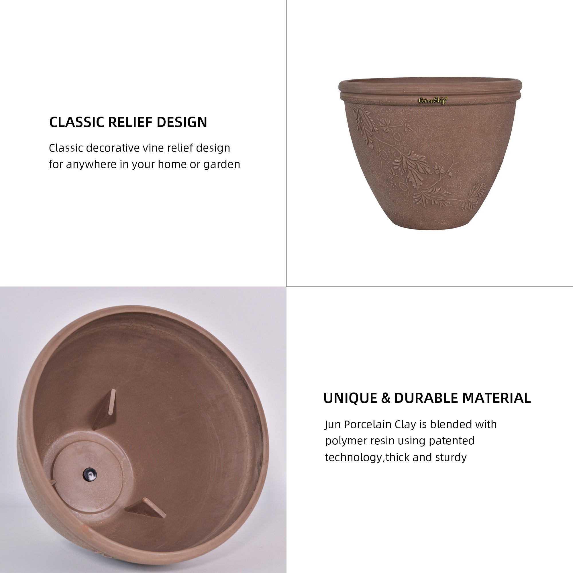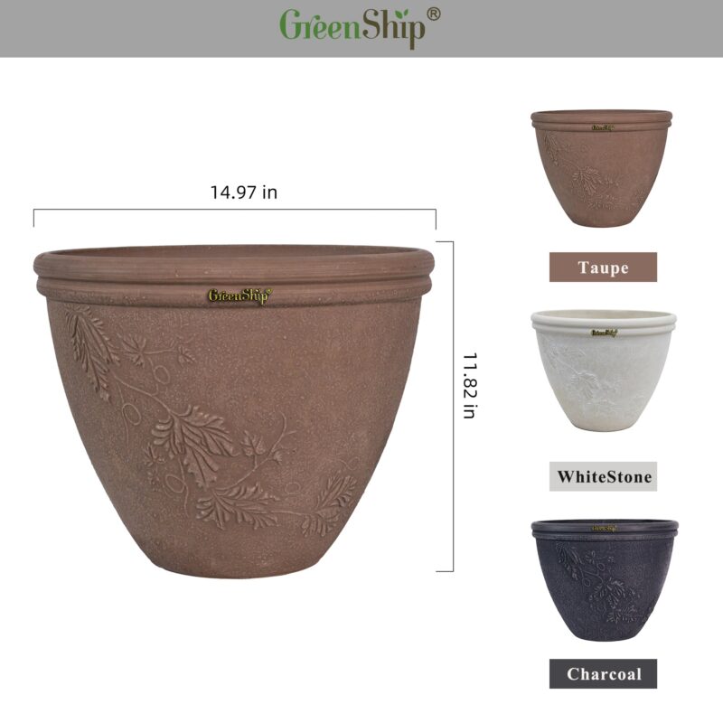 GreenShip’s 15-inch planter features a unique square shape with realistic wood grain planks, adding a casual yet stylish accent to both indoor and outdoor spaces. Made from a durable blend of recycled resin and clay powder, this planter is break-resistant, weather-resistant, and UV color fast, ensuring long-lasting beauty and functionality. Equipped with a drainage hole to prevent water buildup, it promotes healthy plant growth. Available in Chocolate, Light Grey, and Taupe, this versatile planter is perfect for enhancing your home, patio, or garden with both elegance and durability.