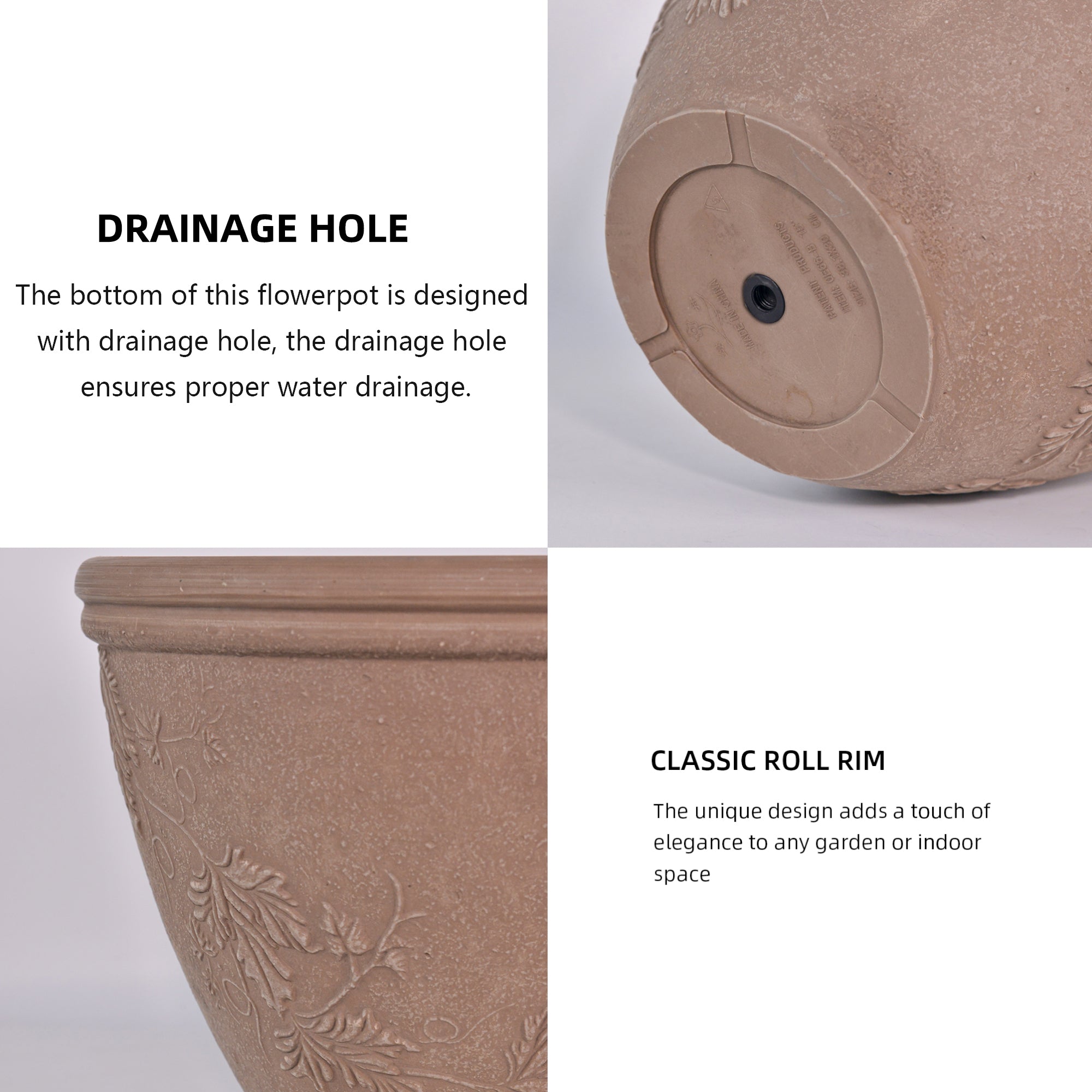 Drainage Hole: The bottom of the flowerpot is designed with drainage holes to ensure smooth drainage.
