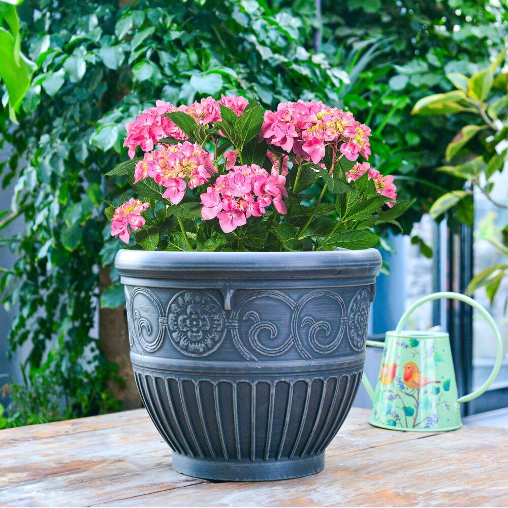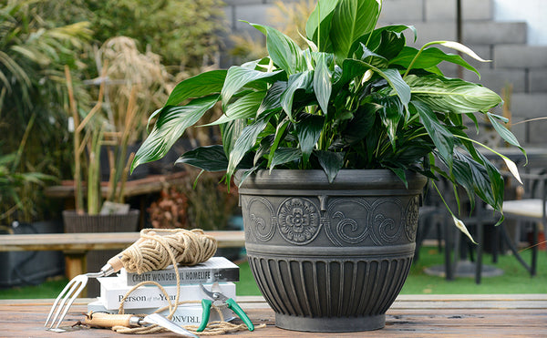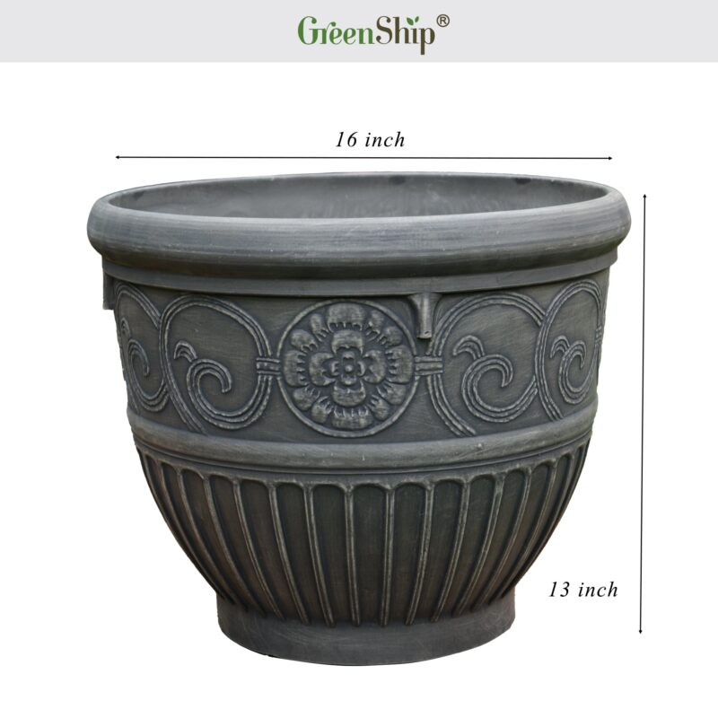 The GreenShip 16-inch large planter features a stately, elegant round rim egg shape with classic reliefs, including fluted ribbed details and medallion scroll designs. Made from a durable blend of recycled resin and clay powder, this planter is break-resistant, weather-resistant, and UV color fast, ensuring long-lasting beauty without fading. Perfect for both indoor and outdoor spaces, it adds a decorative touch to your home, patio, porch, or garden. Equipped with a drainage hole to promote healthy plant growth, this large planter is both stylish and functional. Available in Black, Charcoal, and Taupe.