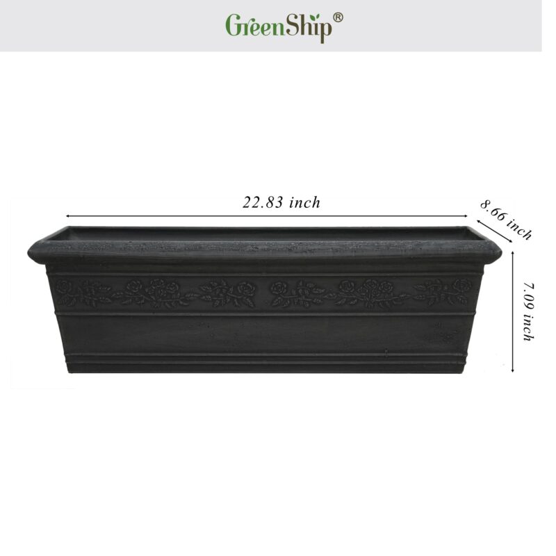 The GreenShip 23-inch box planter features an elegant, classic design with a heavy rim and intricate floral embossing, offering a timeless addition to any space. Made from a durable blend of recycled resin and clay powder, this break-resistant, weather-resistant, and UV color fast planter ensures long-lasting beauty without fading. Equipped with a drainage hole to promote healthy plant growth, it is ideal for both indoor and outdoor use. Perfect for enhancing your home, decks, windows, patio, porch, or garden, this box planter adds both functionality and decorative charm. Available in Black, Charcoal, and Taupe.