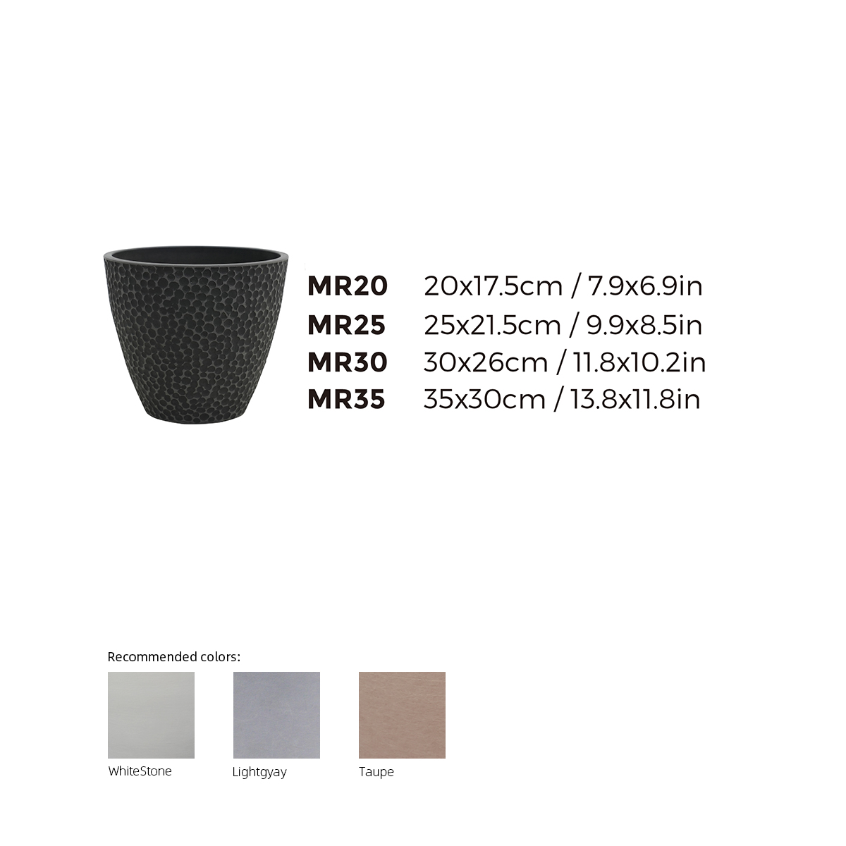 1. World quality manufacturer of flower pot with 30 years experience in production and R & D 2. Two manufacturing facilities, two research institutes and one marketing center 3. 130 patents with 9 world’s only invention patents 4. Our production Line of 3D Printers and mould workshop can meet custom needs 5. Our Composite patented material is eco-friendly, non-toxic 6. naturally looking,sturdy,durable and with a life span up to 20years 7. aging-resistant,anti-UV and weather-resistant 8. Breathable, good for plant growth 9. A rich variety of styles and colors with over 100 new items per year