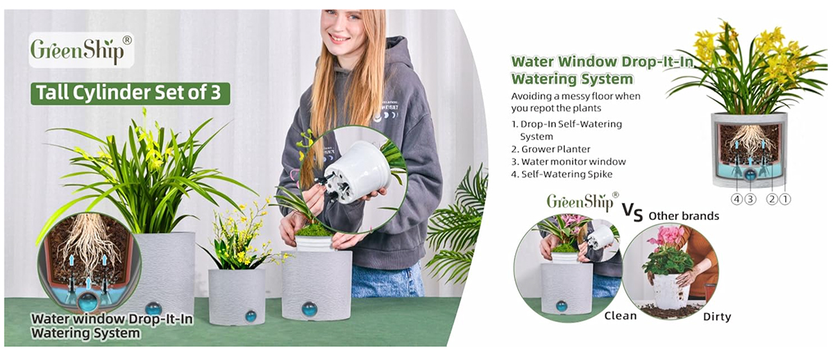 If you’re still struggling to find the perfect planter then check out our latest product—the Drop-It-In Self-Watering System Planter. This innovative pot doesn’t require repotting; simply insert the spikes into the bottom of the grower’s pot, drop it into the planter, and it creates a self-watering system! Plus, the Clear Water Window on the side of the pot allows you to easily monitor the water level, preventing messy spills and overwatering. Available in three sizes (5/6/8 inch) and two colors (Light Grey/White Stone), this planter is perfect for both indoor and outdoor use, meeting all of your gardening needs. Interested? Click the link below!