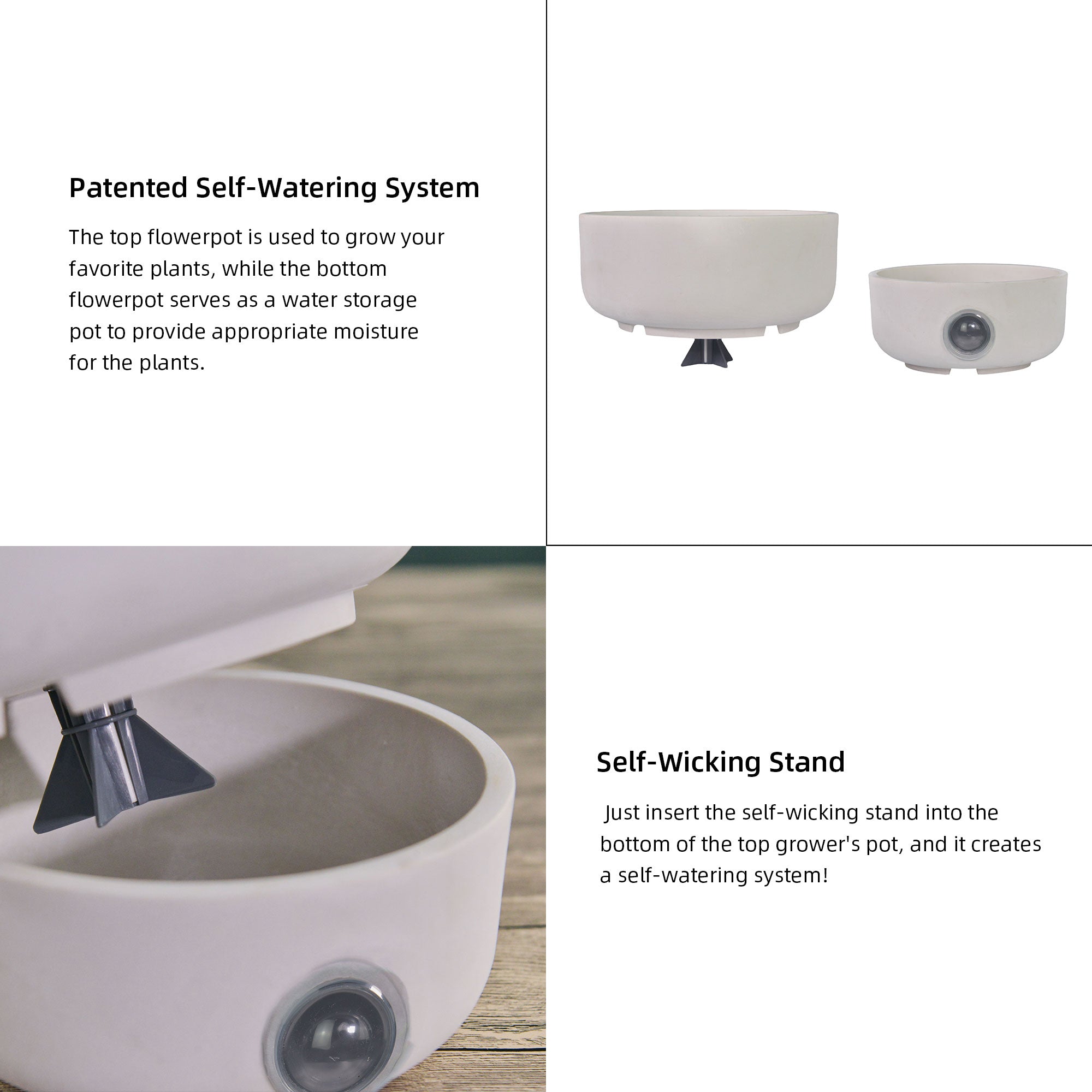 Product kit includes: 2 planters and patented self-watering system kit ONLY