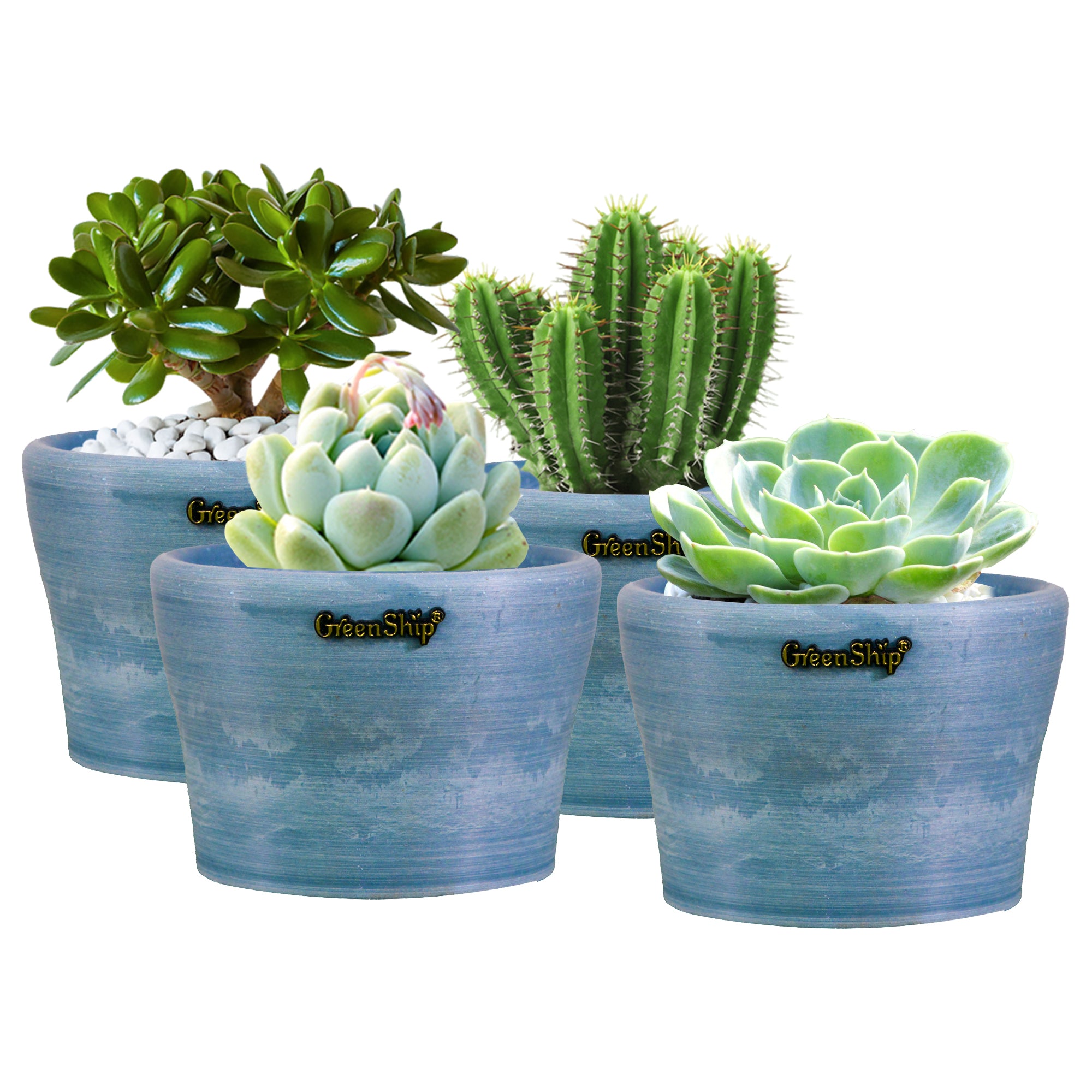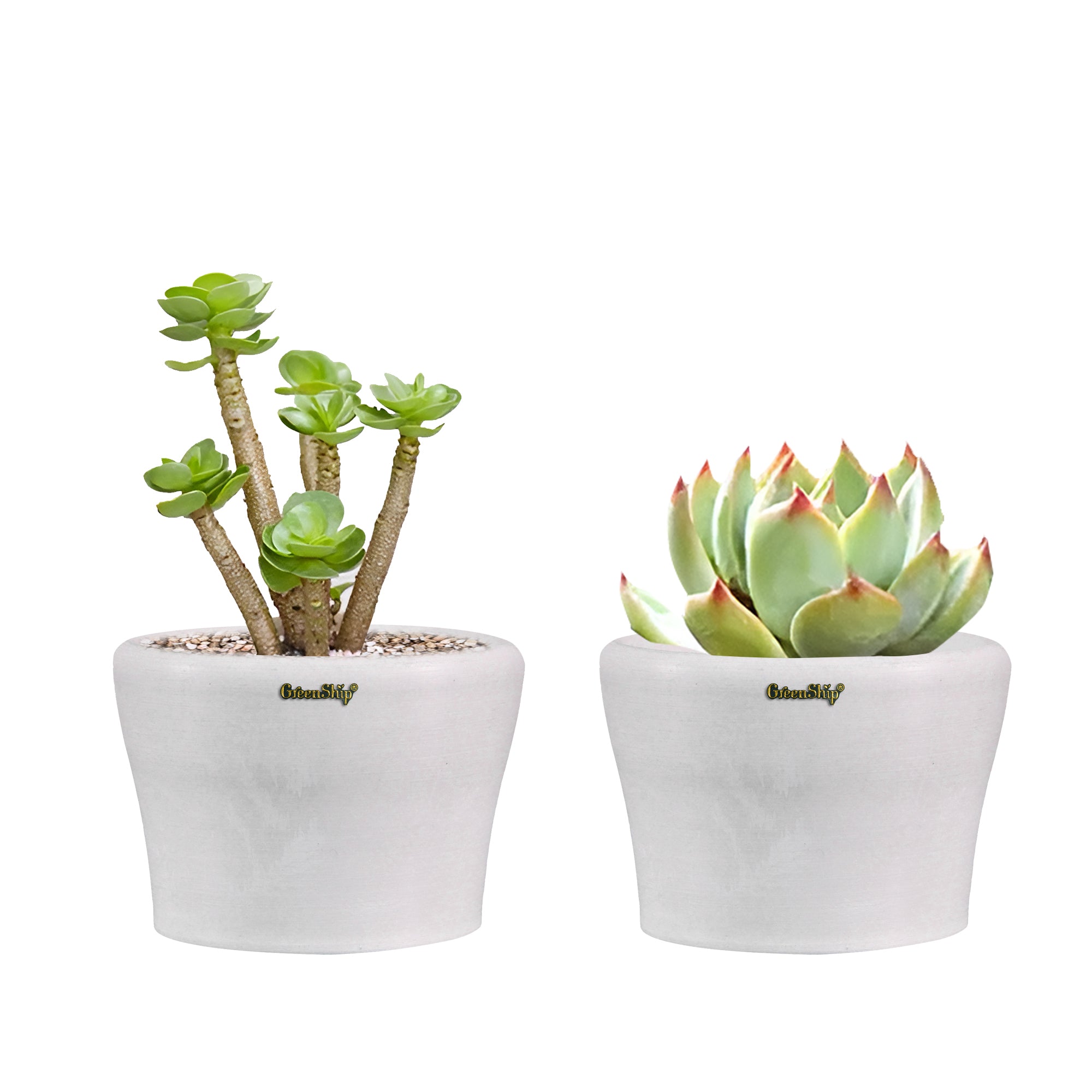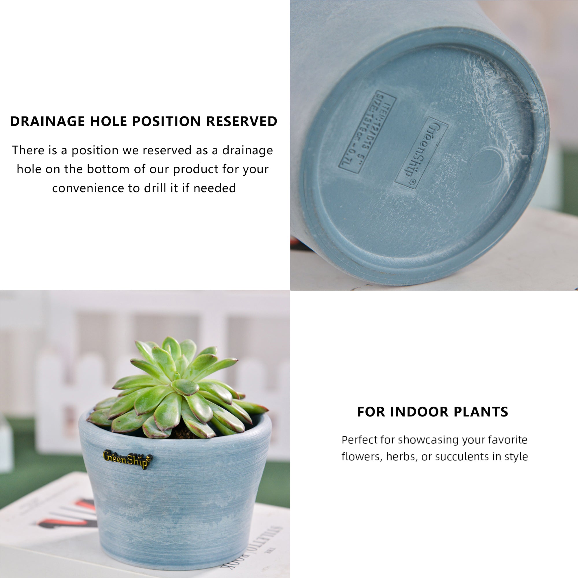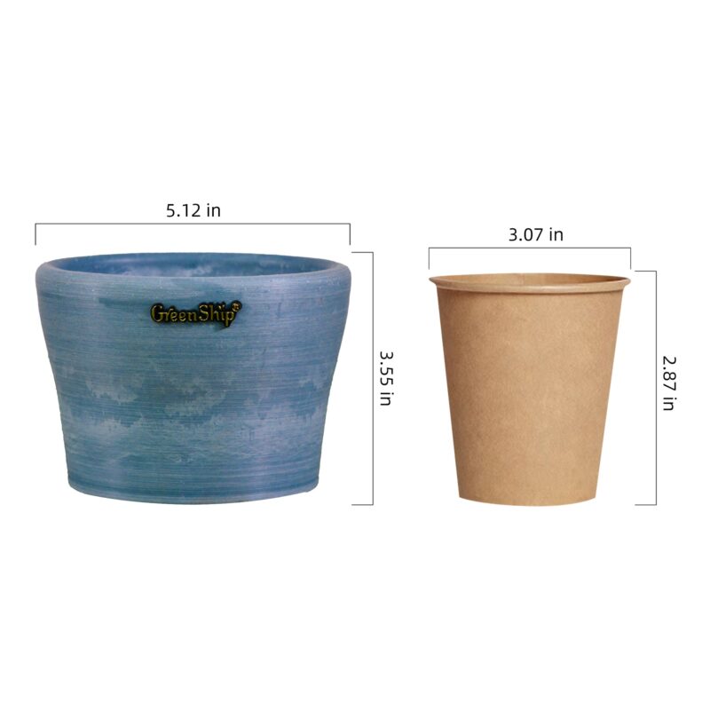 GreenShip’s small planters, featuring a 5-inch upper diameter, are crafted from a unique blend of recycled resin and clay powder, making them break-resistant and UV color fast. Designed with a cute cup shape and a reserved drainage hole for convenience, these decorative flower pots are ideal for small plants like succulents. Perfect for home and office decor, they brighten up windowsills, shelves, or desks. These stylish planters also make a thoughtful gift for plant lovers, combining both beauty and functionality in one eco-friendly design.