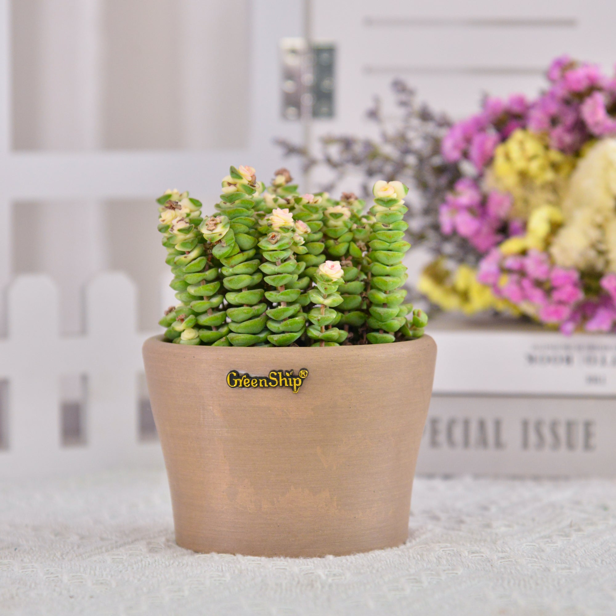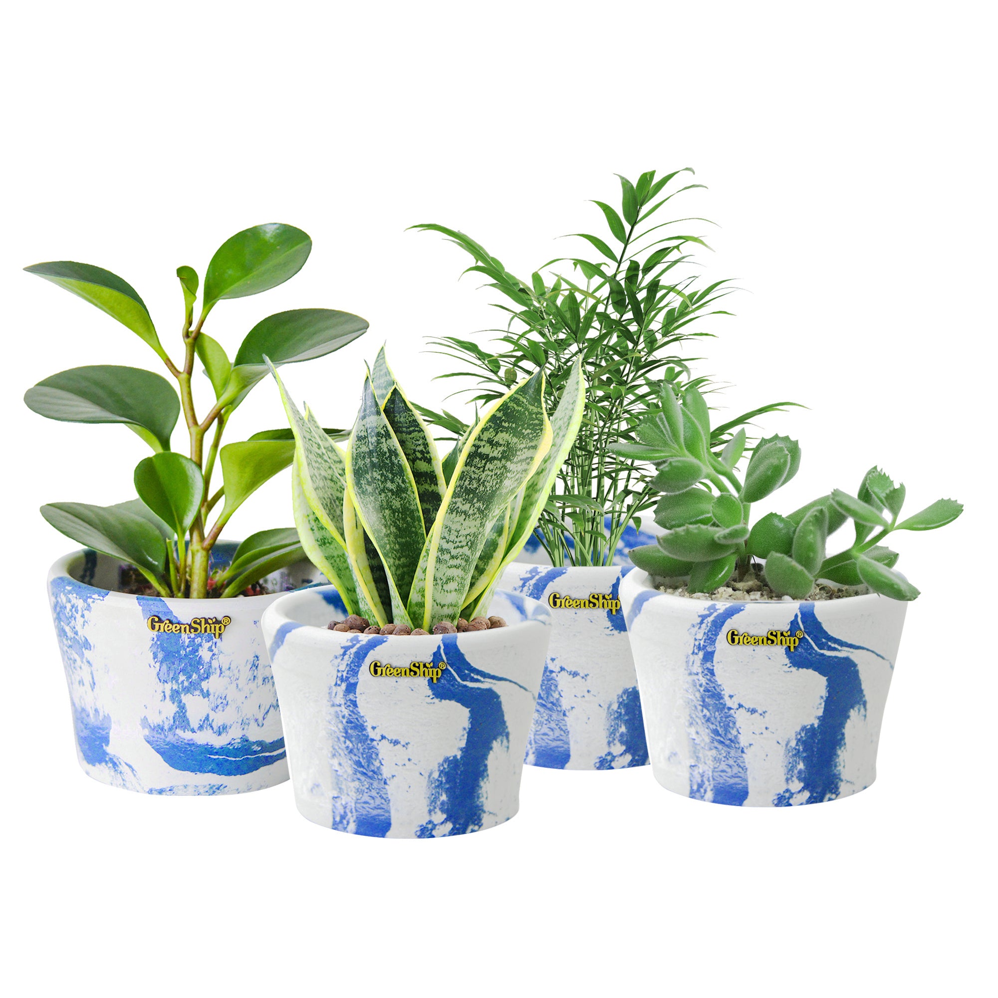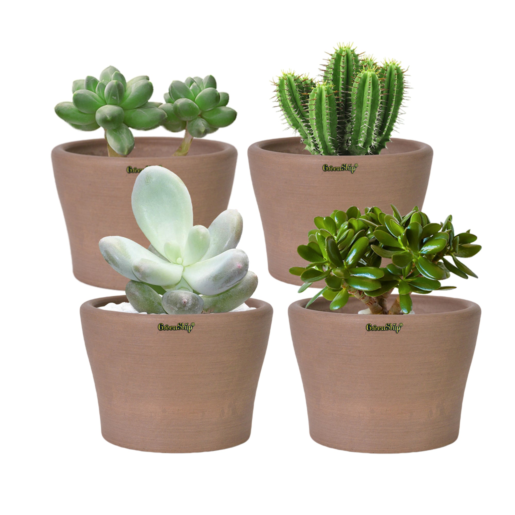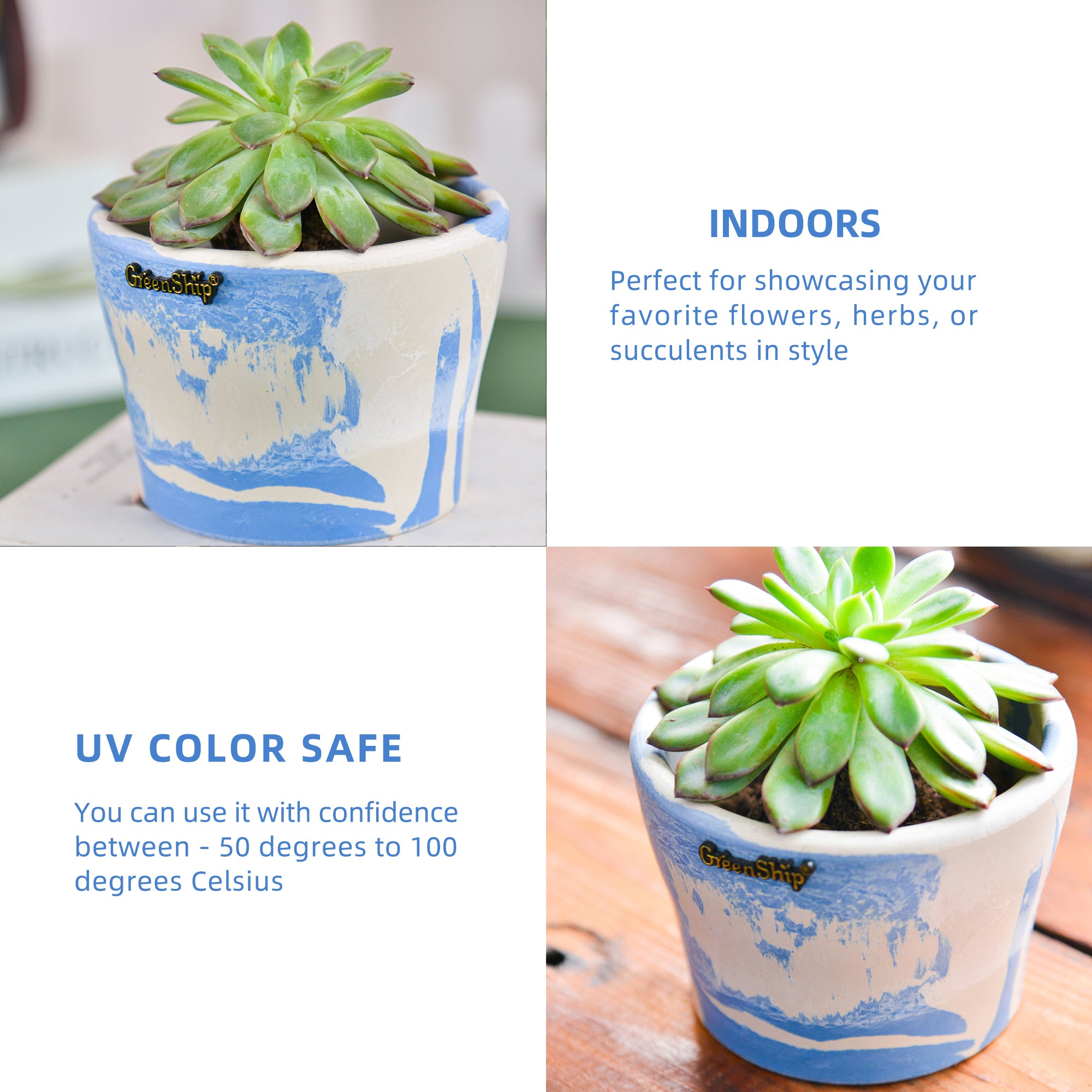 GreenShip’s small planters, featuring a 5-inch upper diameter, are crafted from a unique blend of recycled resin and clay powder, making them break-resistant and UV color fast. Designed with a cute cup shape and a reserved drainage hole for convenience, these decorative flower pots are ideal for small plants like succulents. Perfect for home and office decor, they brighten up windowsills, shelves, or desks. These stylish planters also make a thoughtful gift for plant lovers, combining both beauty and functionality in one eco-friendly design.